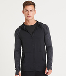 Hood and sleeves 92% polyester/8% elastane.DynamicCool™ responsive blended fabric.Contrast melange effect grown on adjustable hood and raglan sleeves.Taped neck.Full length zip.Front pouch pockets.Thumbholes on cuffs.Tear out label.