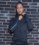 100% polyester french terry. Slim fit. Funnel neck hood with toggles. Full length zip with chin guard and inner zip guard. Raglan sleeves with reflective tape. Two front zip pockets. Inner media pocket. Thumbholes on cuffs. Self fabric bound hem. Flatlock stitching.