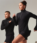 88% polyester/12% elastane peached interlock. Single jersey with wicking finish.Stand up self fabric collar.Raglan sleeves with flatlock stitching.1/4 length zip with chin guard and reflective trim.Reflective detail on back of shoulder seams.Concealed zip key pocket on left back panel seam, with inner headphone access.Side panels.Elasticated bound cuffs and hem.Thumbholes and fold over cuffs.Tear out label.